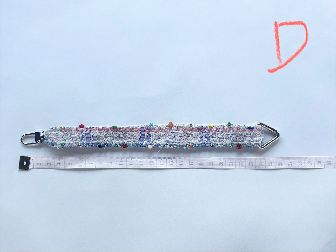 (わたしがスマホに使用しているものは端の金具から反対の金具までで32cmのものです。手首にかけた際ピッタリではなく、かなりゆとりある長さです。用途によってアレンジしたい方のために長さを1点ずつあえて変えています。短いものでも全て手首におさまりますのでご安心ください。ご参考まで。)